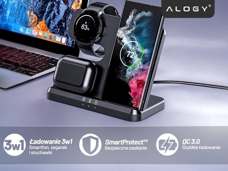⭐ Najnowszy model ⭐ Certyfikat CE/FCC/RoHS ⭐ Ładowanie 3w1 – telefon, zegarek, słuchawki ⭐ Szybkie ładowanie QC 3.0 ⭐ Moc do 15W dla smartfona ⭐ SmartProtect™ – ochrona przed przegrzaniem i zwarciem ⭐ CoolAirFlow™ – kratka wentylacyjna obniża temperaturę ⭐ LightSense™ – diody LED informujące o statusie ⭐ Ładowanie w pionie i poziomie ⭐ Kompatybilność z Samsung i iPhone ⭐ Obsługa etui do 5 mm ⭐