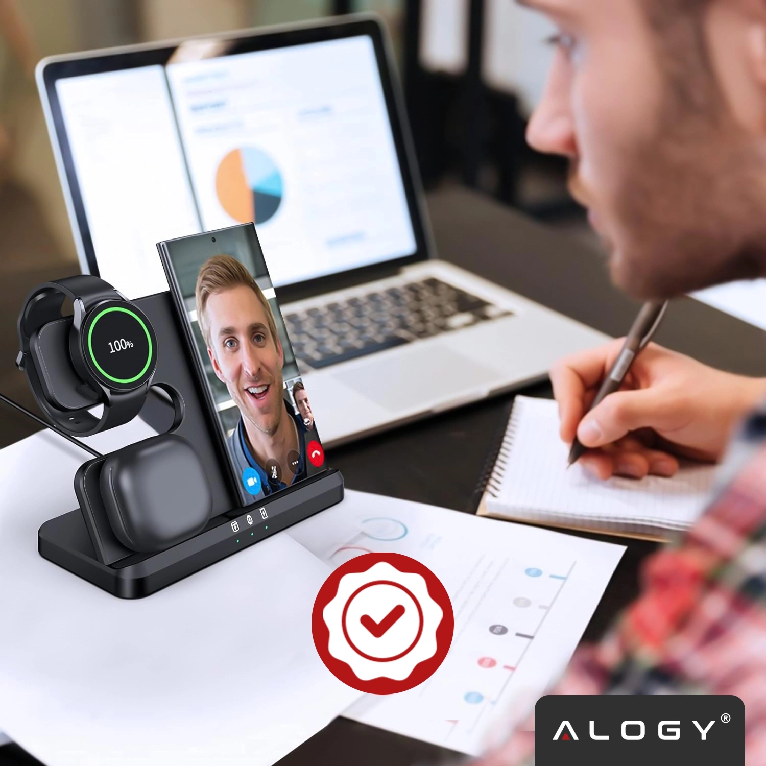 Ładowarka Alogy 3w1 pozwala na jednoczesne ładowanie telefonu, zegarka i słuchawek w jednym miejscu.