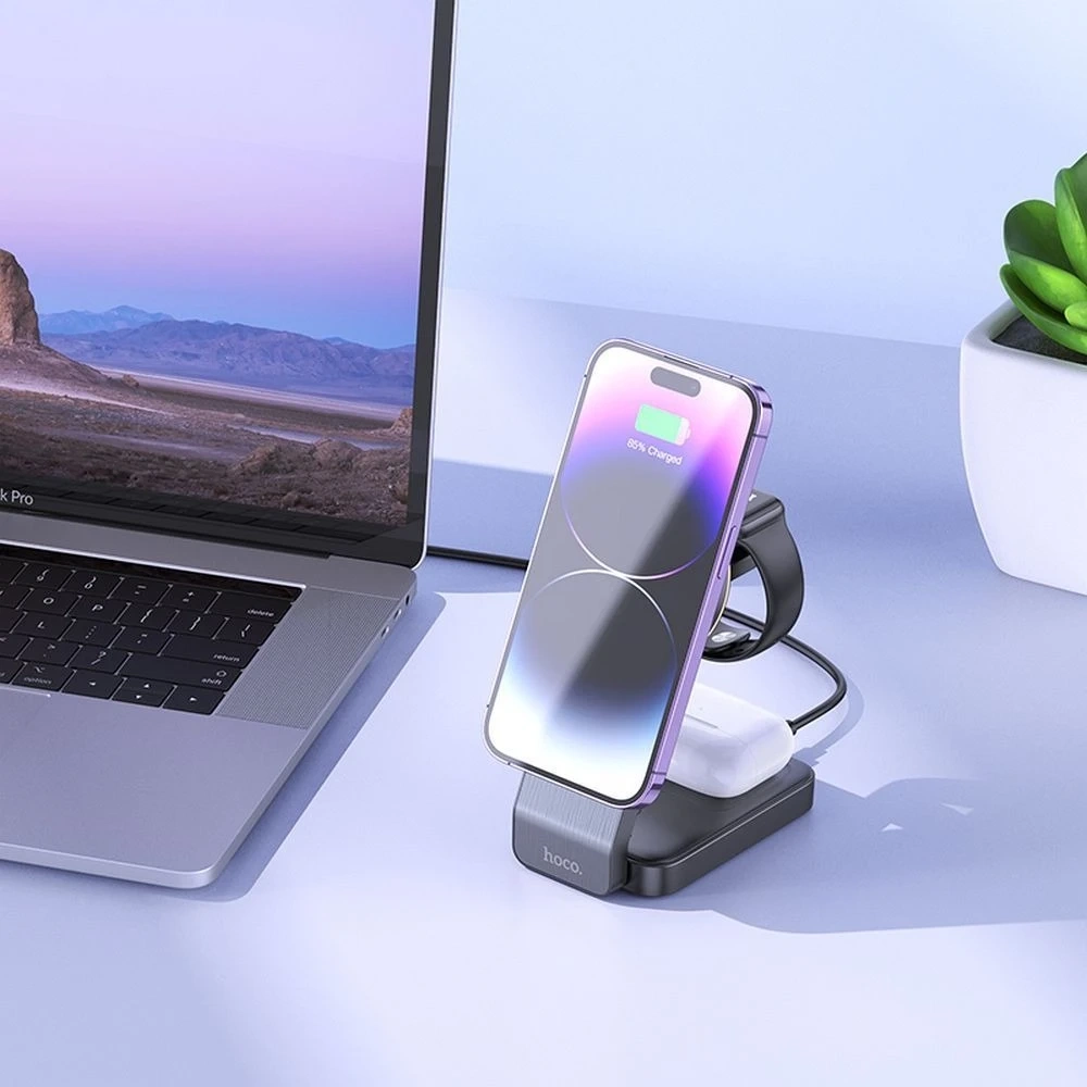 Hoco CQ3 to praktyczna ładowarka indukcyjna 3w1, która umożliwia jednoczesne ładowanie telefonu, słuchawek TWS i zegarka Apple Watch. Dzięki wsparciu dla MagSafe i mocy do 15W, szybko i wygodnie naładujesz wszystkie swoje urządzenia – bez plątaniny kabli i potrzeby korzystania z trzech osobnych ładowarek.