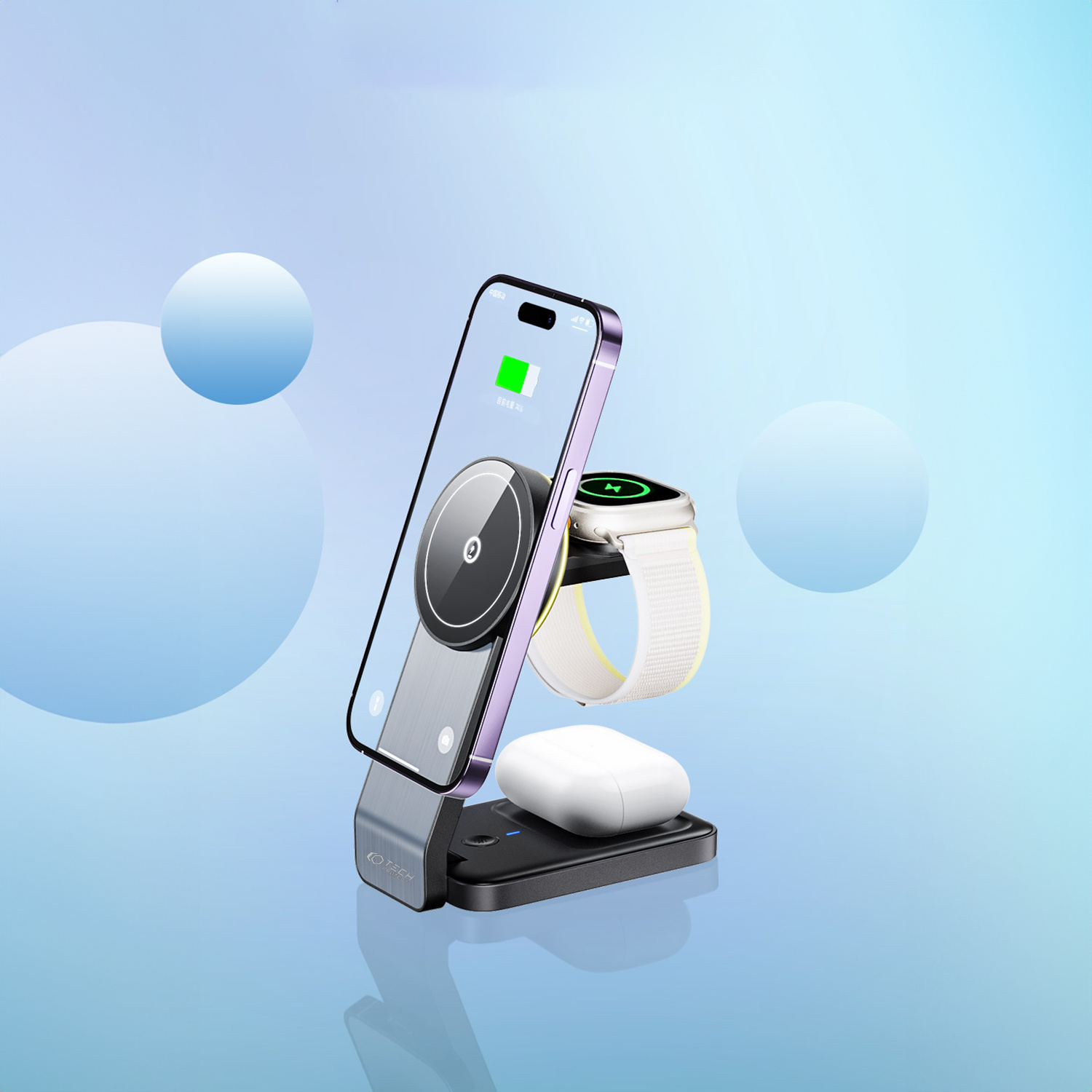 Ładowarka indukcyjna 3w1 umożliwia bezprzewodowe ładowanie trzech różnych urządzeń jednocześnie, zapewniając wsparcie dla smartfonów, słuchawek i zegarków. Dodatkowo posiada wbudowaną lampkę LED, którą można obsługiwać dotykowym przyciskiem.