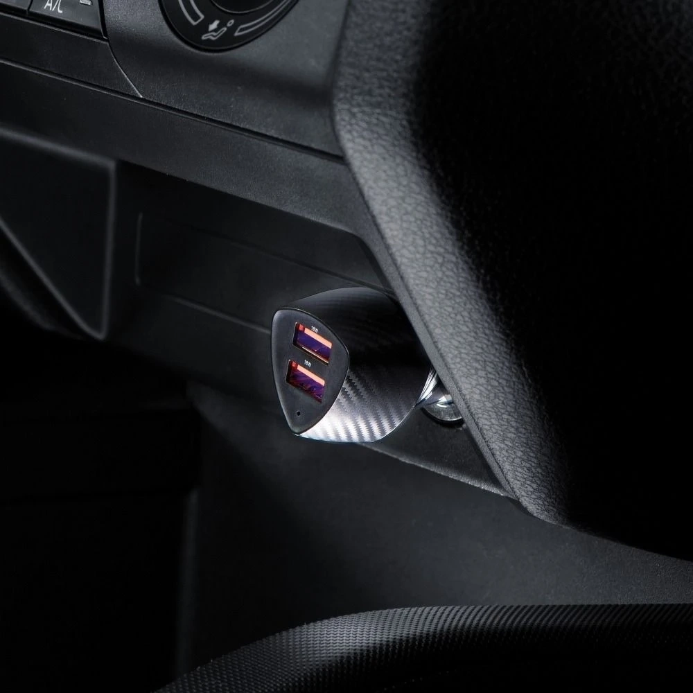 Niezwykle funkcjonalna ładowarka samochodowa z serii FORCELL CARBON. Wyposażona w podwójny port ładowania USB. Wspiera protokół szybkiego ładowania QC 3.0. Posiada kilkustopniowy system zabezpieczeń.