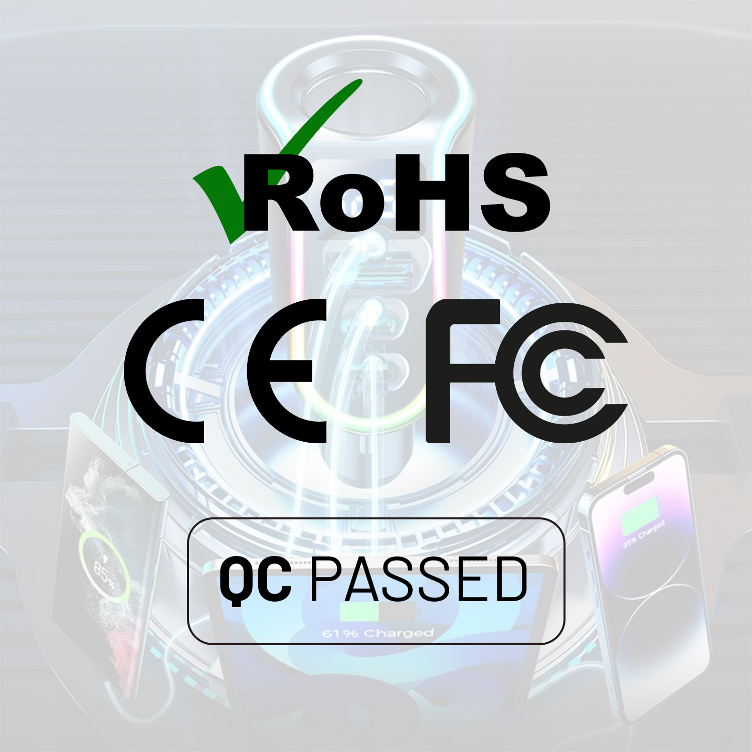 Ładowarka posiada certyfikaty CE, ROHS, FCC oraz QC PASSED