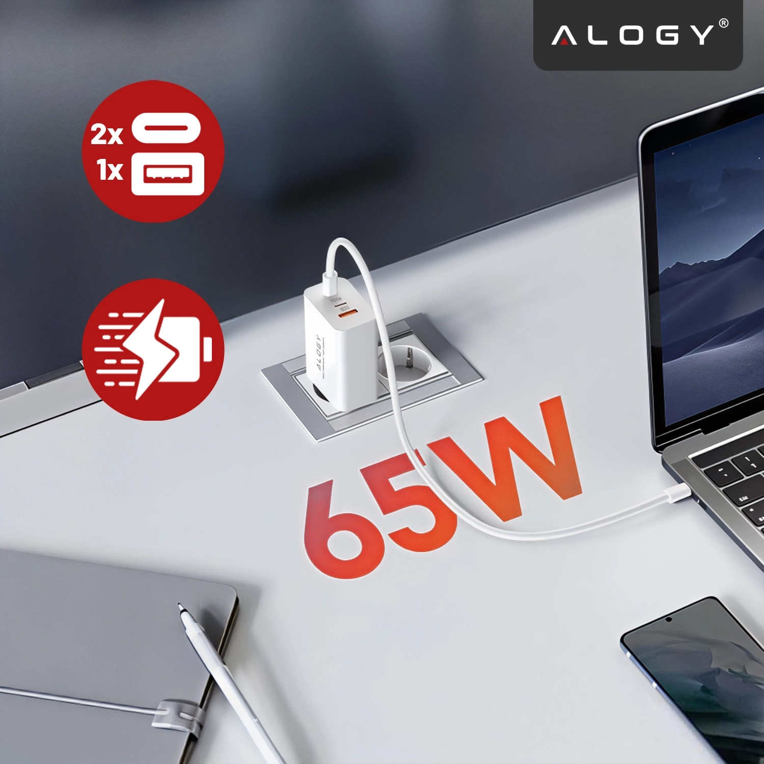 ▶️ Alogy GaN 65W 3-portowa ładowarka sieciowa 2×USB-C + USB-A – PD & QC