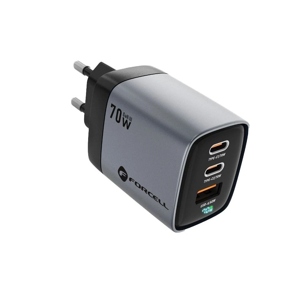 Ładowarka sieciowa z wyświetlaczem LCD FORCELL F-ENERGY GaN III 2 x Typ C + USB A 70W Szara x 1