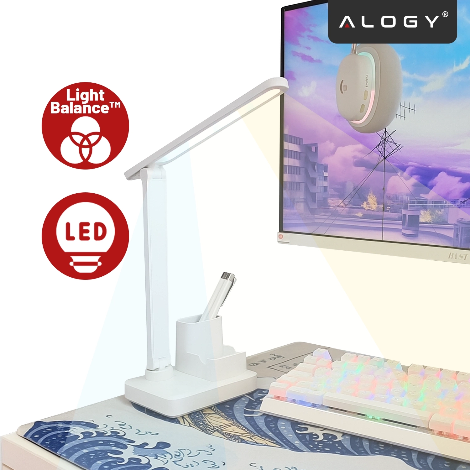 Lampka biurkowa nocna LED – akumulator 2400 mAh, organizer na długopisy i telefon, regulowane światło, idealna na biurko i do nauki – Alogy Light&Organize™ Biała
