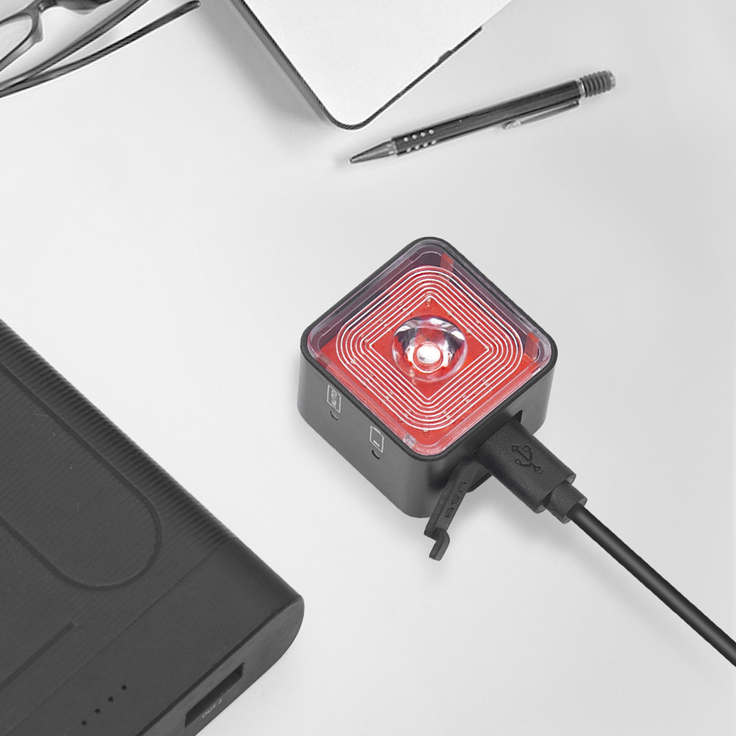 Lampki posiadają w zestawie kabel USB dzięki któremu możemy naładować nasze lampki a także mocowania silikonowe do montażu lampek.