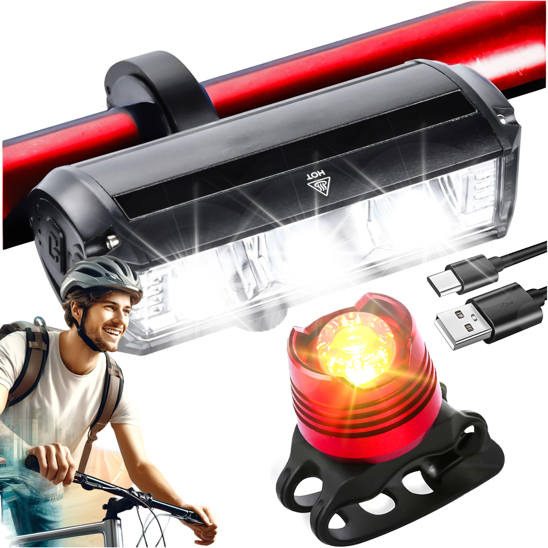 Lampka tylna posiada uniwersalny gumowy pasek montażowy. Lampka przednia kompatybilna z każdym rowerem (górkim/ MTB, szosowym, miejskim, trekkingowy, elektrycznym, itd). Warunkiem koniecznym jest grubość kierownicy, która musi mieścić się w przedziale o 2.2cm do 2.5cm.