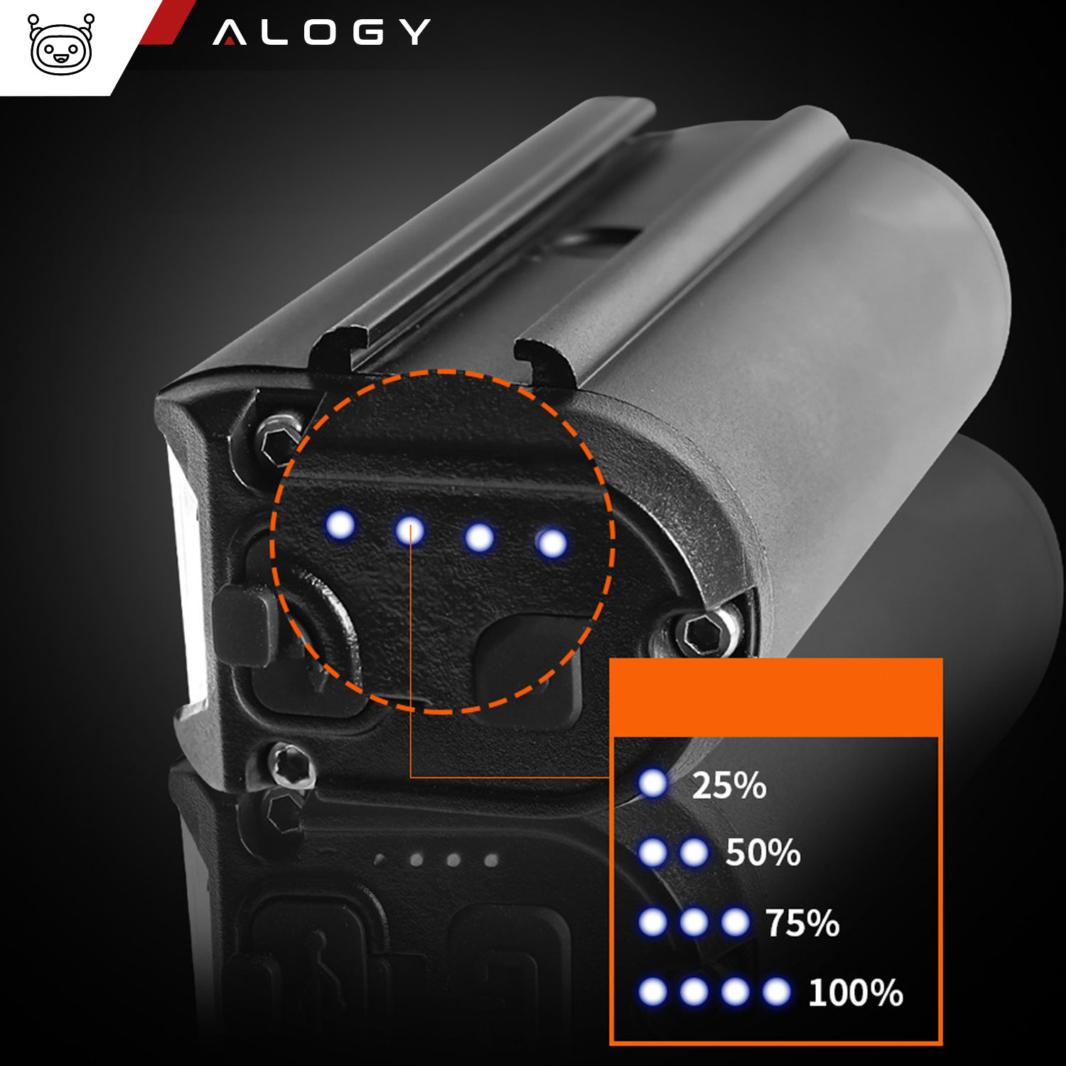 W bocznej części lampki znajdują się 4 diody LED w kolorze niebieskim, które informują o stanie naładowania baterii - takie rozwiązanie sprawi, że nie będziemy zaskoczeni rozładowaną baterią.
