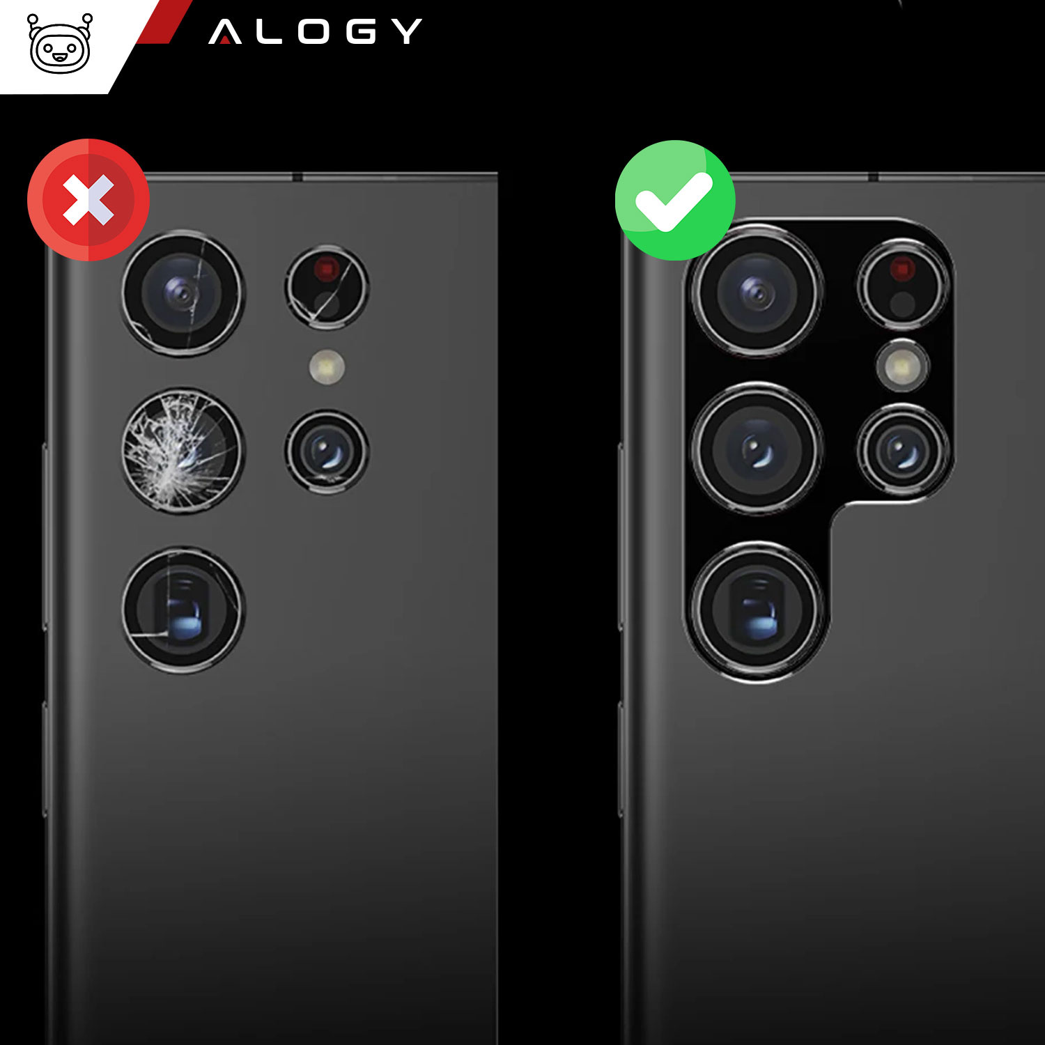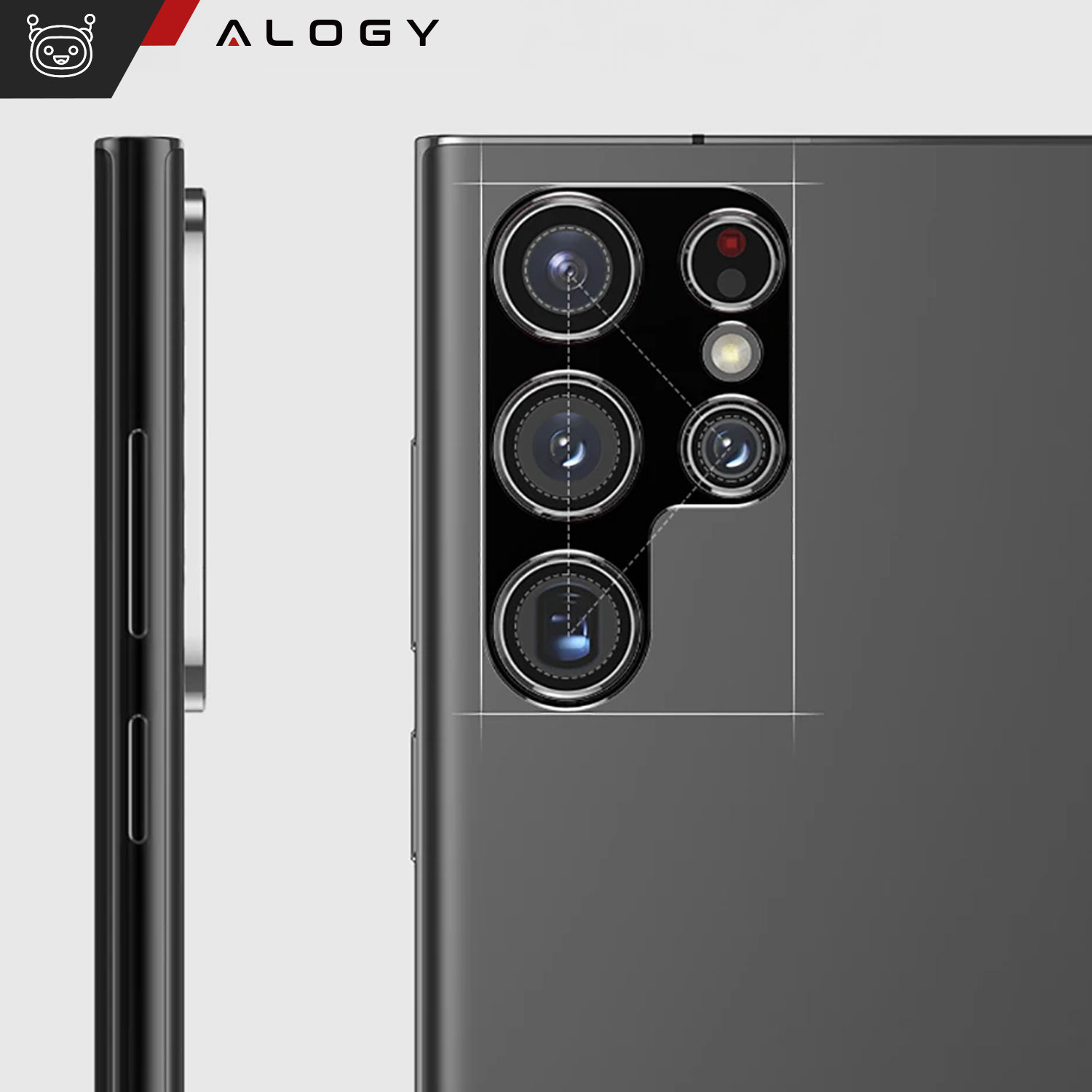 Osłonka metalowa firmy Alogy przeznaczona na tylną wyspę obiektywów aparatu Samsung Galaxy S24 Ultra.