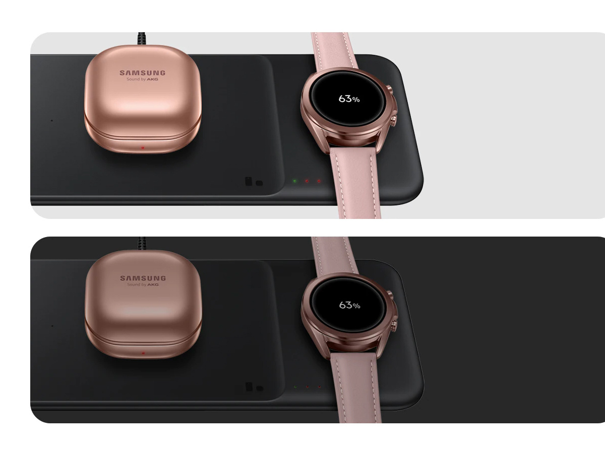 Ładowarką bezprzewodową marki Samsung naładujesz do trzech kompatybilnych urządzeń jednocześnie. Po lewej stronie możesz ładować dwa smartfony albo smartfon i Galaxy Buds. Prawa strona jest dedykowana wyłącznie dla Twojego Galaxy Watch, a wbudowany magnes ustawi Twój smartwatch w odpowiedniej pozycji po odłożeniu.