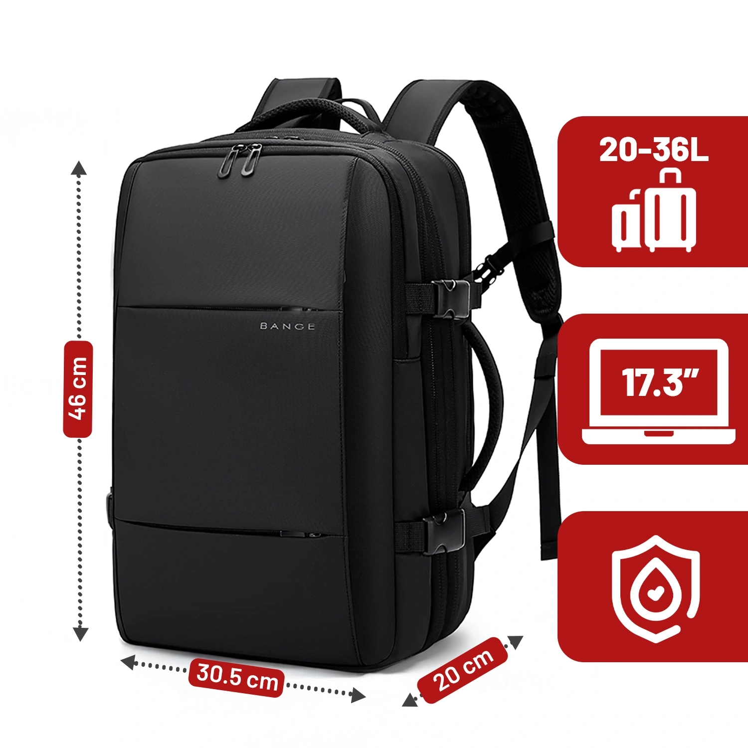 • Wodoodporny plecak Bange 17" z rozszerzaną konstrukcją o pojemności do 36 litrów. Wykonany z trwałych materiałów, posiada liczne kieszenie, komorę próżniową, wentylowany tył i regulowane szelki. Idealny na laptopa, do pracy i podróży.