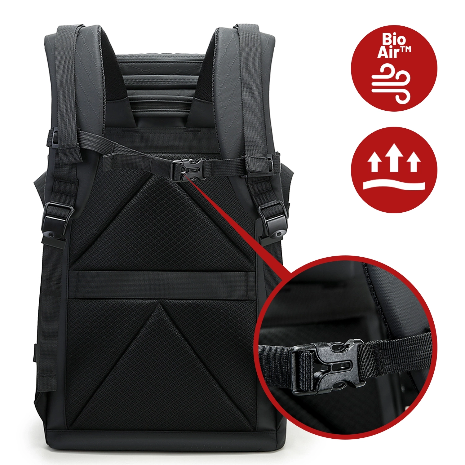 ✅ System BioAir™ w tylnej ściance plecaka oraz ergonomiczne, regulowane szelki z pasem piersiowym zapewniają wygodę i idealne dopasowanie.