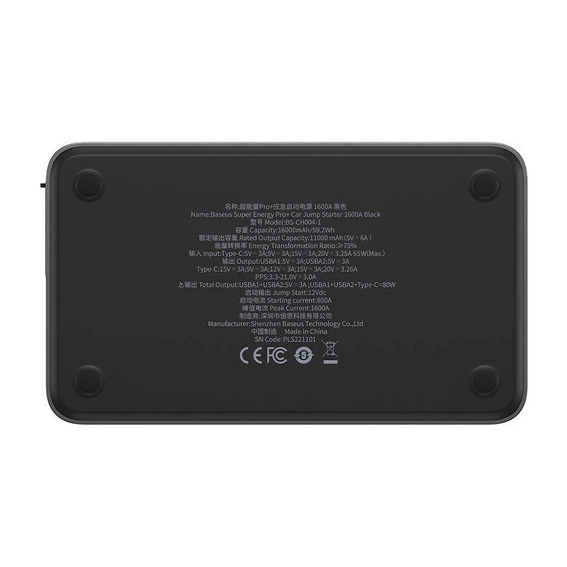 Producent Baseus Nazwa Powerbank / Rozrusznik Baseus Super Energy PRO Car Jump Starter, 1600A, USB (czarny) Model CGNL070001 Pojemność akumulatora 16000 mAh/ 59.2 Wh Pojemność wyjściowa 10500 mAh (5V = 6A) Wskaźnik przetwarzania energii 75% Wejście Typ-C: 5V/3A; 9V/3A; 15V/3A; 20V/3.25A 65W max Wyjścia USB1: 5V/3A; USB2: 5V/3 A; USB-C: 20V/3.26A; 15V/3A; 12V/3A; 9V/3A Całkowita moc wyjściowa USB-1+USB-2: 5V/3A; USB-1+USB-Typ-C 15W+65W Prąd stały 12Vdc Prąd rozruchu 800A Natężenie maksymalne 1600A