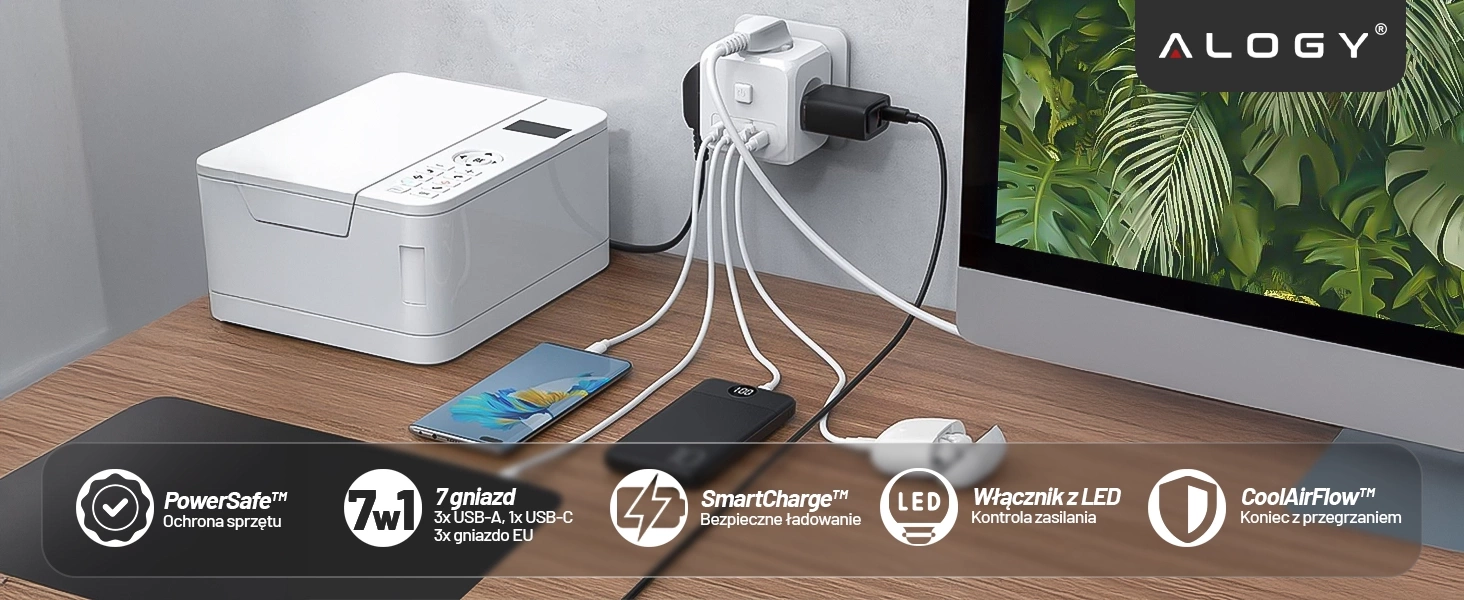 ⭐ Najnowszy model ⭐ Certyfikat CE ⭐ 3 gniazdka sieciowe EU ⭐ 3 porty USB-A do ładowania ⭐ Port USB-C 3A ⭐ Moc 4000W – obsługa sprzętu domowego ⭐ Zabezpieczenie przepięciowe ⭐ PowerSafe™ – automatyczne odcięcie w razie zwarcia ⭐10 lat doświadczenia w branży ⭐ ponad 50.000 zadowolonych klientów marki Alogy ⭐