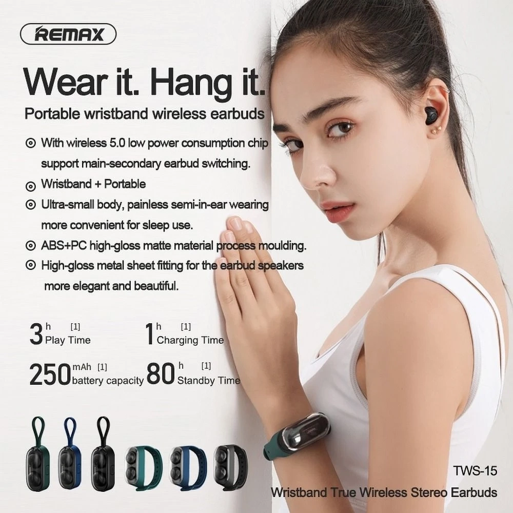 Słuchawki bezprzewodowe Bluetooth REMAX TWS-15 z stacją dokującą w smartbandzie x 1