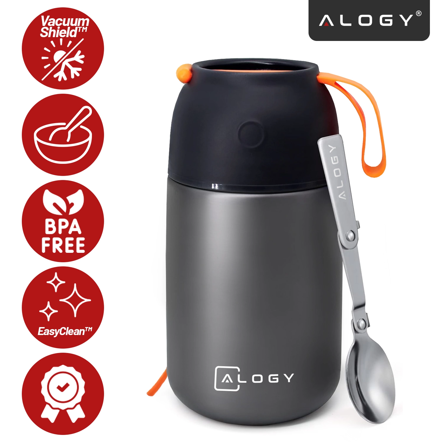 Termos pojemnik obiadowy na jedzenie żywność zupę lód dla dzieci 700ml Alogy ze stali nierdzewnej + składana łyżeczka termiczny szary x 1