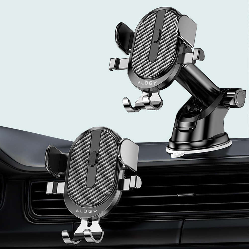 • Uchwyt samochodowy 2w1 Alogy do telefonu 6.5" grawitacyjny na szybę, deskę rozdzielczą, kratkę to nowoczesny uchwyt do samochodu, który kompleksowo zabezpieczy nasze urządzenie w trakcie podróży. Uchwyt pomieści smartfony od 4.5 do 6.5 cala.