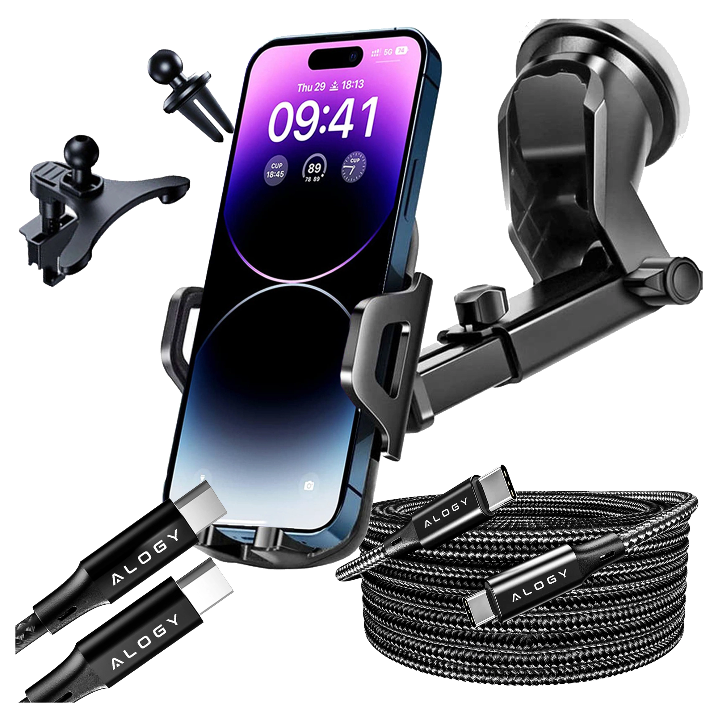 Uchwyt samochodowy do telefonu do auta 3w1 Alogy na szybę do kratki na deskę rozdzielczą kokpit Czarny + Kabel x 1