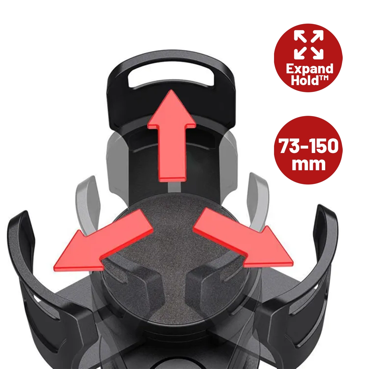 ✅ ExpandHold™ górny regulowany uchwyt – rozszerza się od 73 mm do aż 150 mm. Oznacza to, że bez problemu zmieścisz kubek termiczny, lunchbox, a nawet tablet czy telefon w dużym etui.