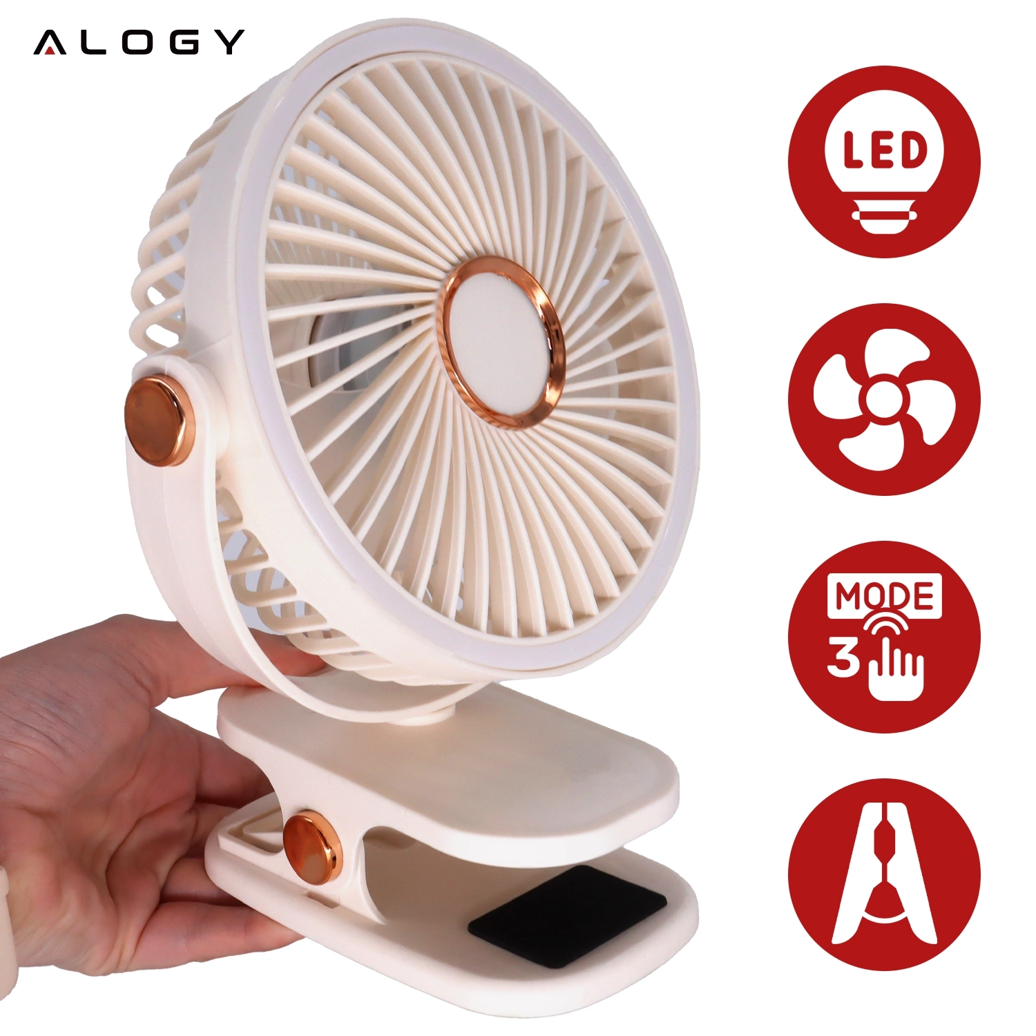 Wentylator wiatrak 2800 mAh wiatraczek LED przenośny klips Alogy biurkowy na biurko wózek dla dziecka bezprzewodowy beżowy