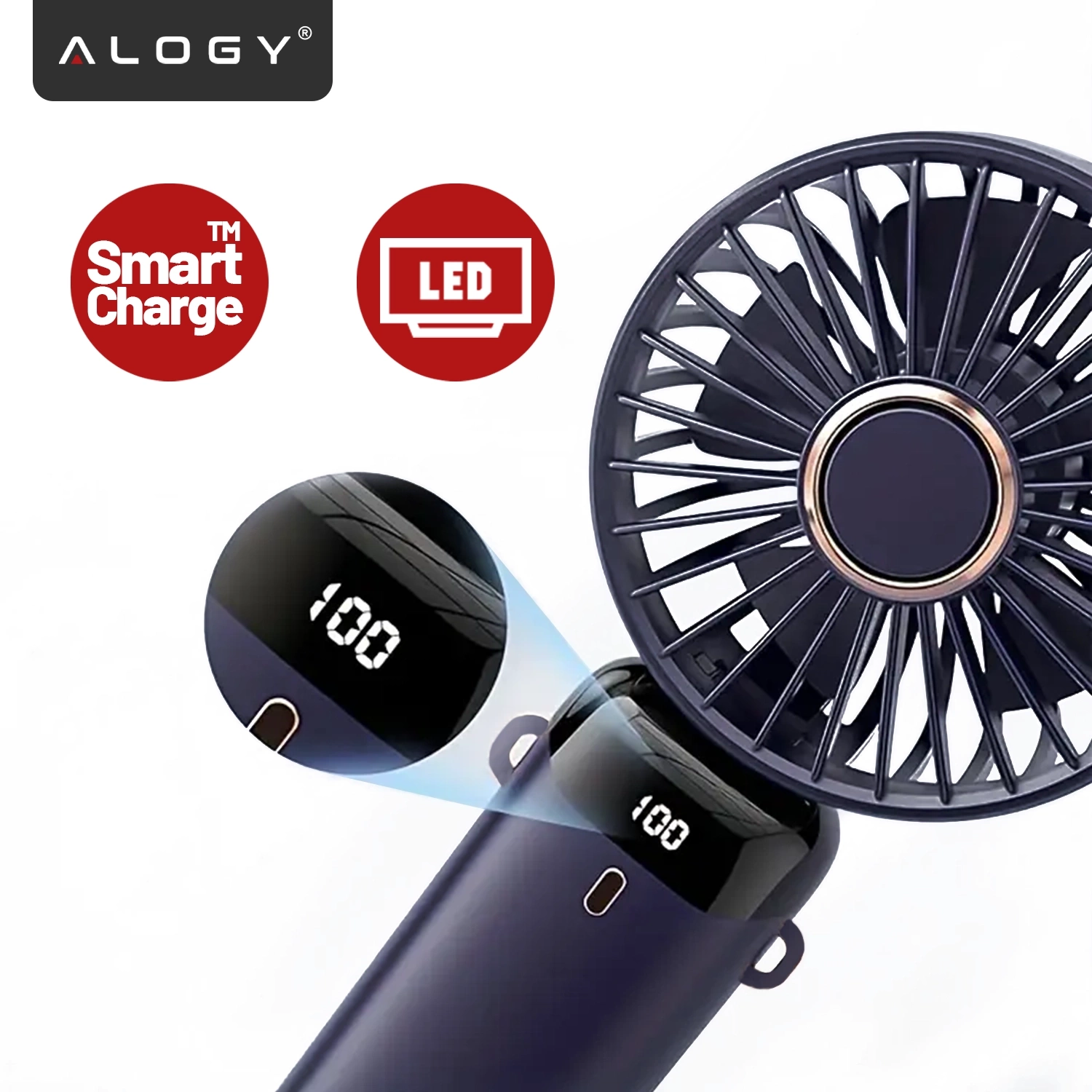 Wentylator Wiatrak Ręczny Bezprzewodowy, Przenośny i Biurkowy, z Uchwytem na Telefon, Ładowanie USB-C, Bateria 18650, Alogy CoolBreeze™ – Granatowy x 1