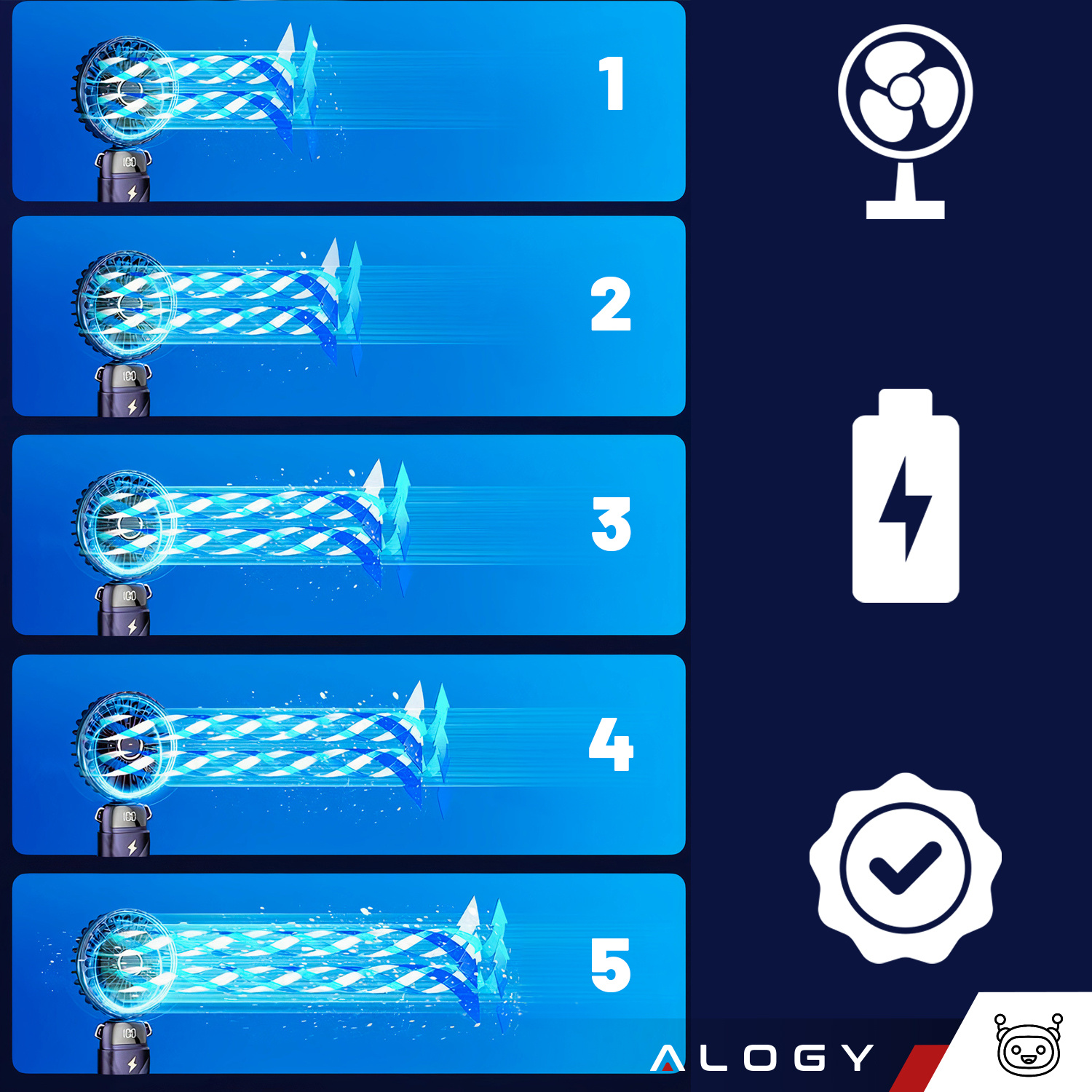✅ Nasz mini wentylator posiada aż 5 poziomów prędkości nadmuchu. W prosty i szybki sposób dopasujesz prędkość nawiewu do swoich potrzeb - wystarczy wciskać kolejno przycisk znajdujący się na rączce.