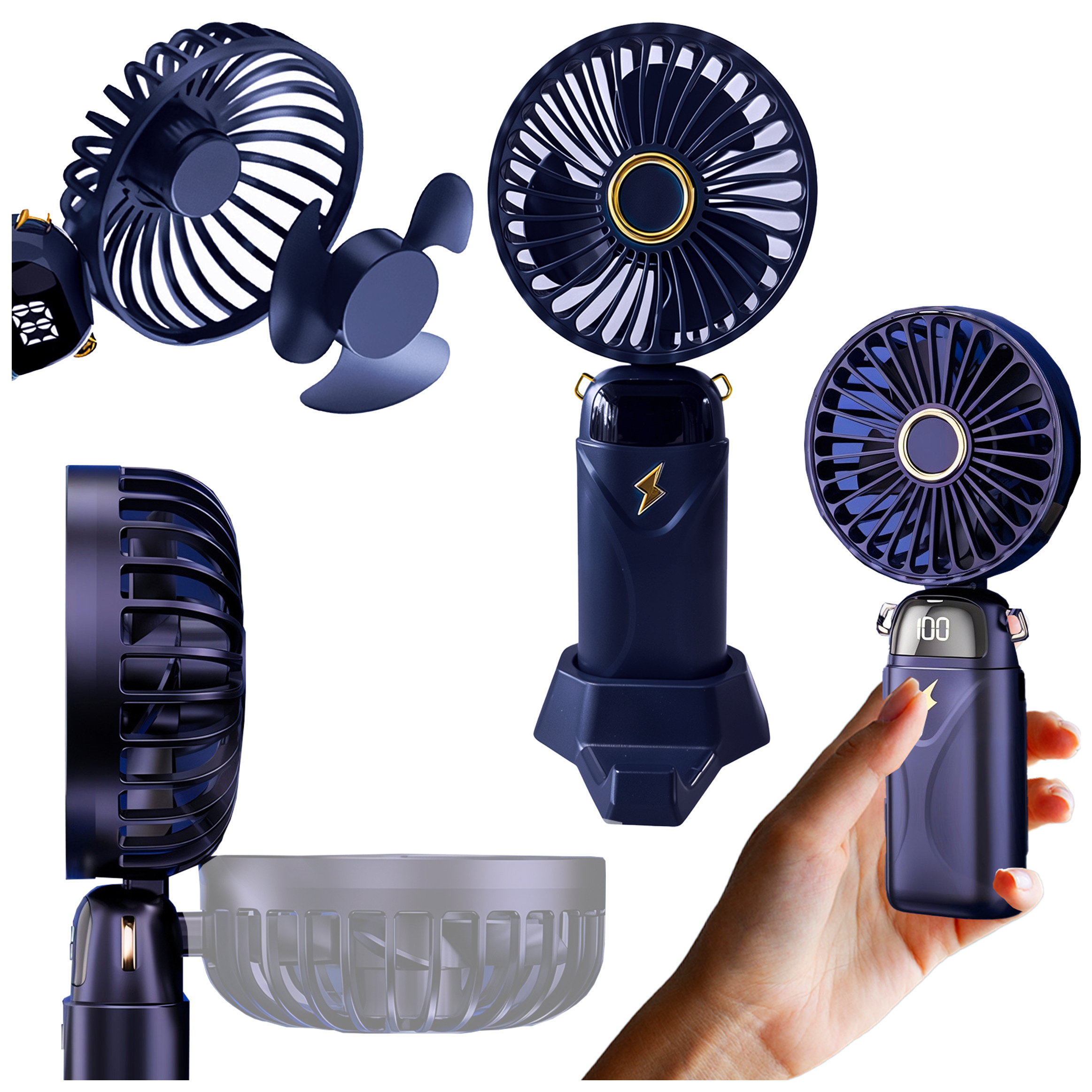 Wentylator wiatrak wiatraczek ręczny biurkowy Alogy bezprzewodowy przenośny stojący z podstawką na telefon Granatowy x 1