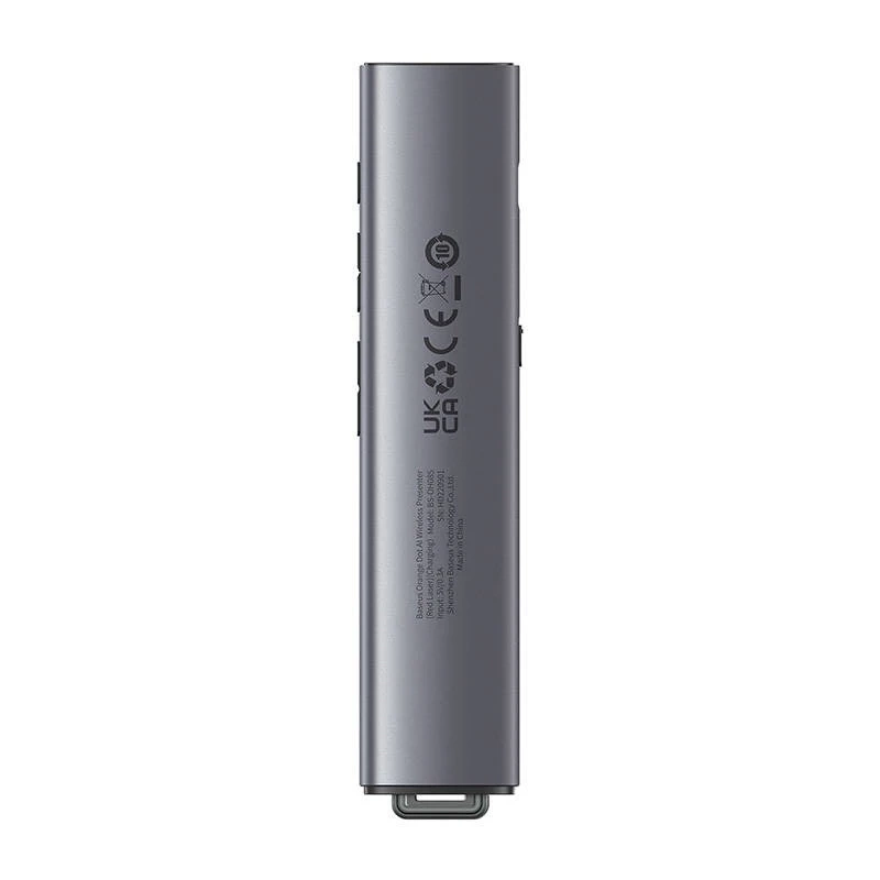 Producent Baseus Nazwa Orange Dot AI Wireless Presenter (Red Laser) (Charging) Model WKCD020013 Kolor Szary Materiał Stop aluminium + PC + ABS Częstotliwość robocza 2400-2490 MHz Zasięg zdalnego sterowania Do 50 m Zasięg wskaźnika laserowego Do 100 m Zasięg rejestracji dźwięku Do 1 m Kolor wskaźnika laserowego Czerwony Pojemność akumulatora 300 mAh / 3,7 V Port ładowania USB-C Wejście 5 V / 0,3 A Wymiary 30 x 137 x 10 mm Waga Ok. 56 g